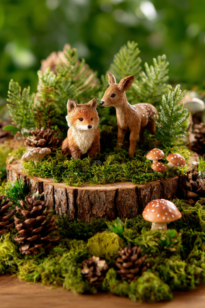 Use a wooden slice or bark piece as your base, then arrange small animal figurines among moss, pinecones, and miniature trees or mushrooms. Incorporate earthy tones like forest green, rust orange, warm brown, and cream. Small twigs or branches add height and authentic forest feel to your arrangement.