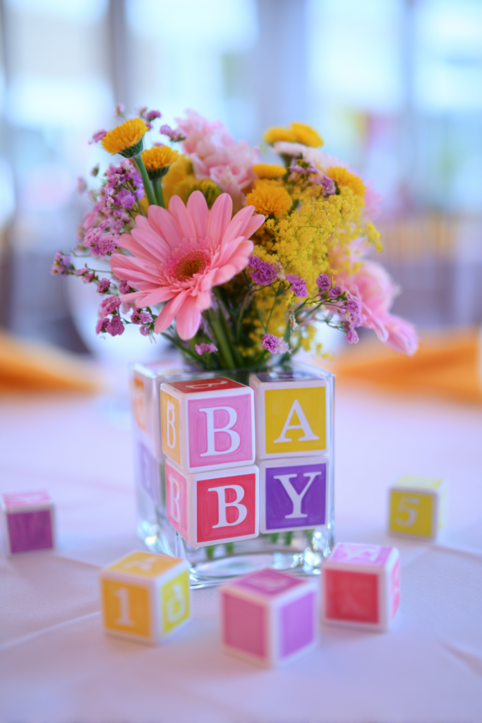 Create a focal point by placing a larger arrangement of flowers or a stuffed animal in the center, then surround it with blocks spelling out your message. This versatile centerpiece works for any gender and ties into themes of learning, growth, and childhood wonder. Plus, the blocks become toys for the baby to enjoy for years to come.