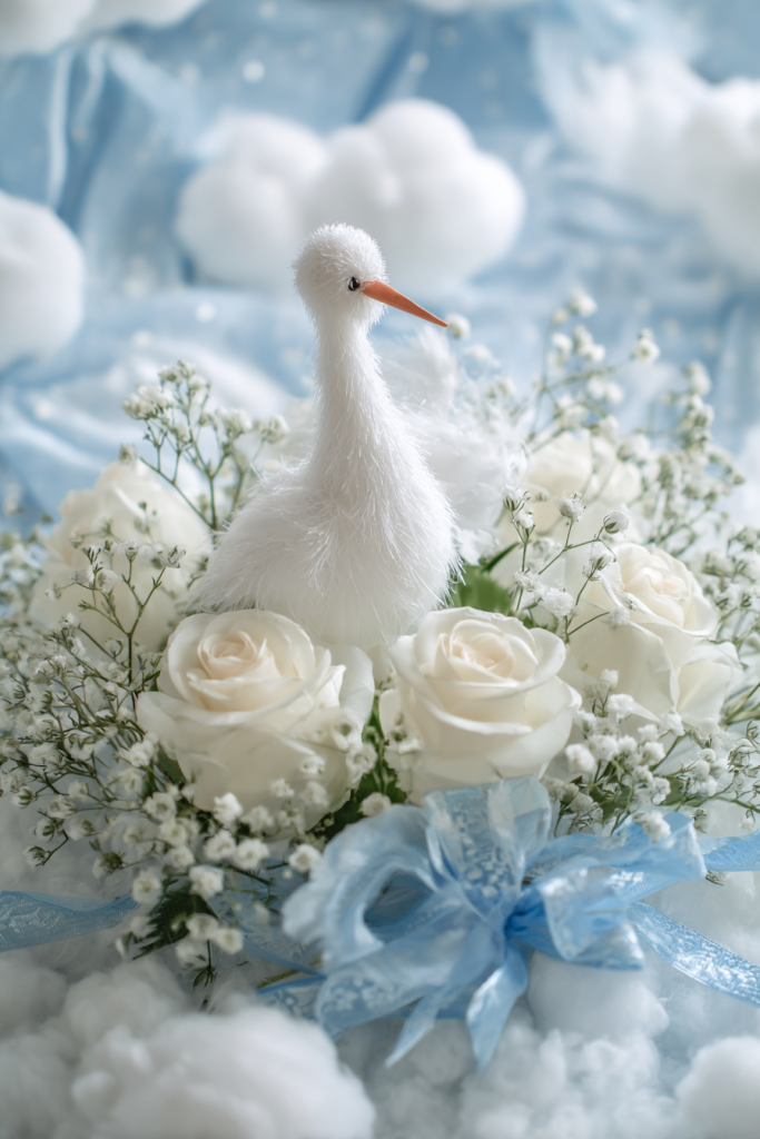 Use a white or silver stork as your focal point, placing it on a base of fluffy cotton or white tulle to represent clouds. Incorporate light blue accents for baby boys or soft pink for girls, though white and ivory keep things beautifully neutral. Add white roses, baby’s breath, or hydrangeas around the base for elegant floral touches.