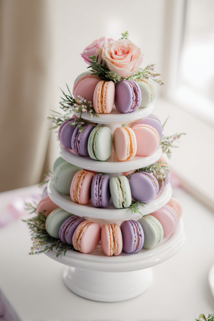 Arrange macarons on a tiered cake stand or acrylic tower in coordinating colors—think soft pink, mint green, lavender, and ivory. The varying shades create an ombre effect that’s incredibly photogenic. Intersperse small fresh flowers or greenery between the tiers for added dimension and romance.