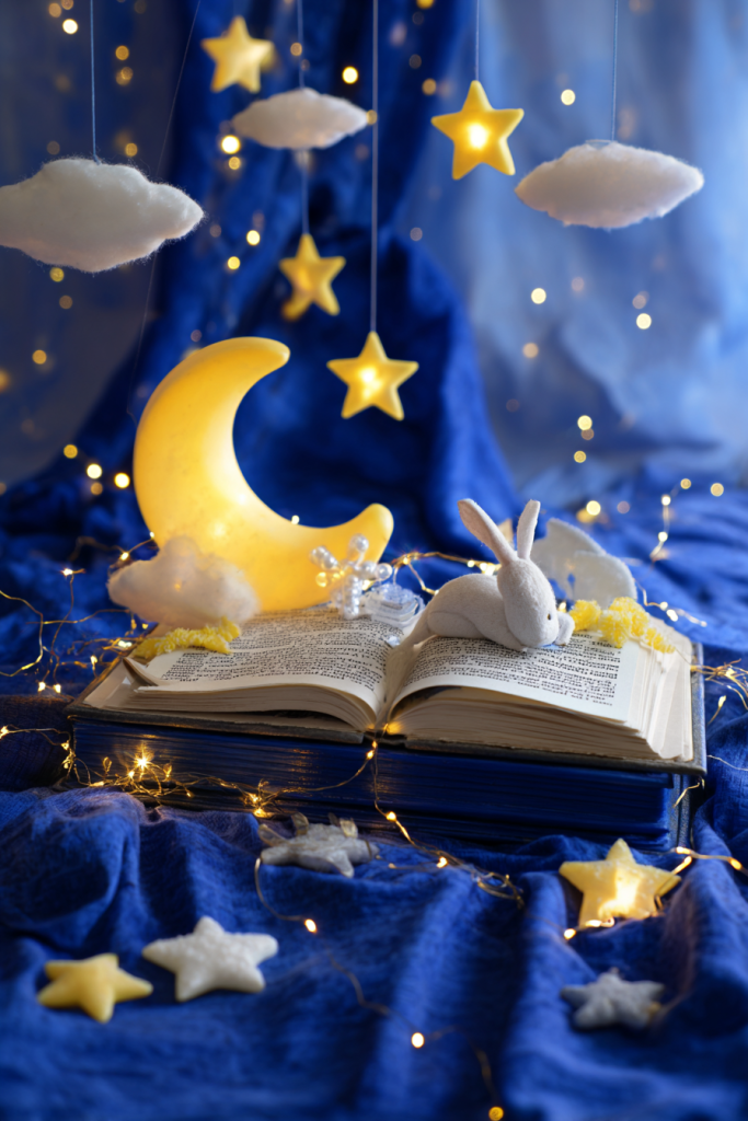 Place a copy of the book as part of your centerpiece display, opened to a favorite illustration. Surround it with crescent moon decorations, star confetti, and small LED candles or fairy lights for that bedtime glow. Use navy blue, soft yellow, and white as your color palette to mimic nighttime skies.