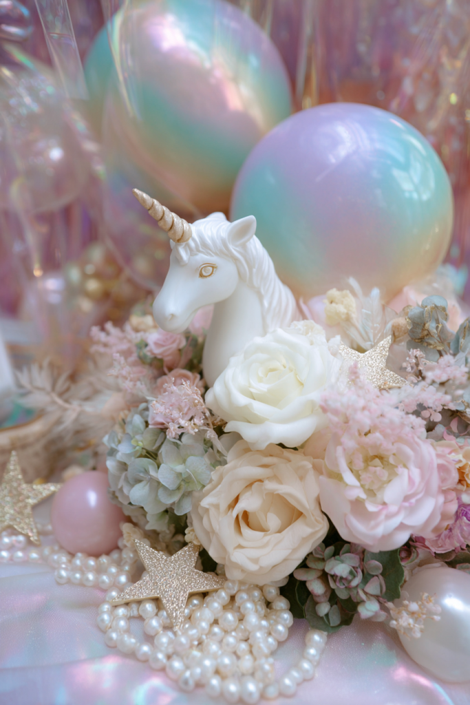 Place a ceramic or resin unicorn figurine as your centerpiece star, surrounding it with flowers in rainbow pastels or metallics. Add iridescent elements like sequined fabric, holographic confetti, or pearl strands for that magical shimmer. Incorporate balloons in coordinating colors, tying them to your centerpiece base or letting them float above.