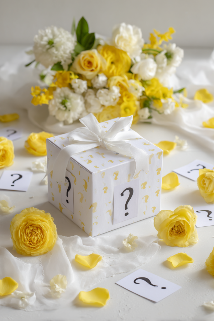 Use a decorated box or basket as your centerpiece base, filled with white or yellow balloons, tissue paper, or confetti that will reveal pink or blue when opened. Surround the mystery container with neutral flowers in white, yellow, and green. Add question marks on small signs or tags scattered around the arrangement.