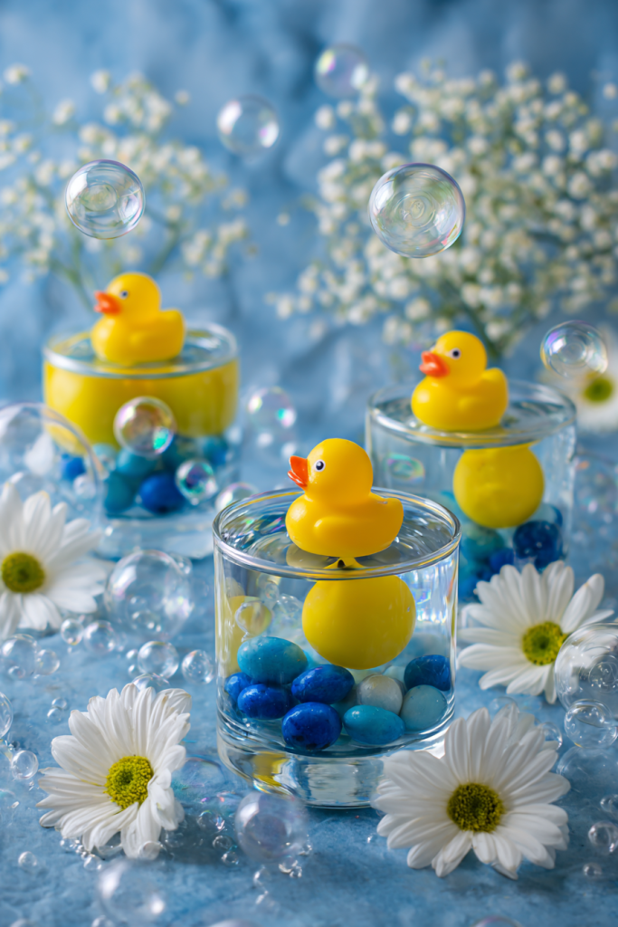 Use clear plastic ornament balls partially filled with water and a small duck inside for a bubble effect. Scatter additional ducks across your table for continuity. White and yellow flowers like daisies or tulips complement the theme without competing with it. This centerpiece is budget-friendly, easy to assemble, and universally beloved by guests of all ages.