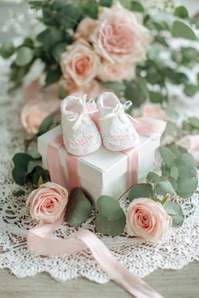 Place a pair of baby shoes—booties, sneakers, or Mary Janes—on a decorative plate, in a shadow box frame, or atop a gift box wrapped in beautiful paper and ribbon. Surround the shoes with fresh flowers, baby’s breath, or greenery for softness and color. Choose shoe colors that match your theme, or opt for classic white or neutral tones.
