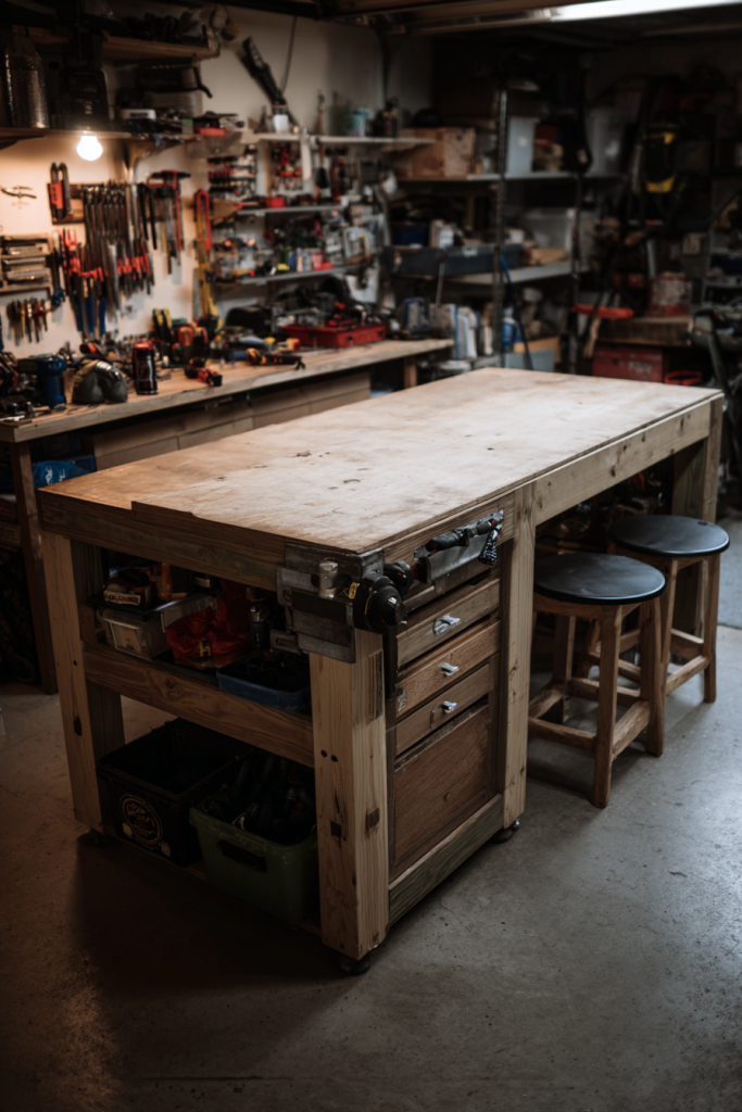 A versatile workbench maximizes your garage’s potential for multiple activities. Choose a sturdy design that can handle both hobby projects and casual dining. I prefer workbenches with built-in storage drawers and lower shelves for tools and equipment. Add a vise or clamp system if you enjoy woodworking or repairs. The surface should be durable enough for heavy-duty tasks yet easy to clean. Consider adding stools that tuck underneath to save space when not in use. This multifunctional approach lets you shift between activities seamlessly. Whether you’re working on a project or hosting friends, the workbench adapts to your needs.