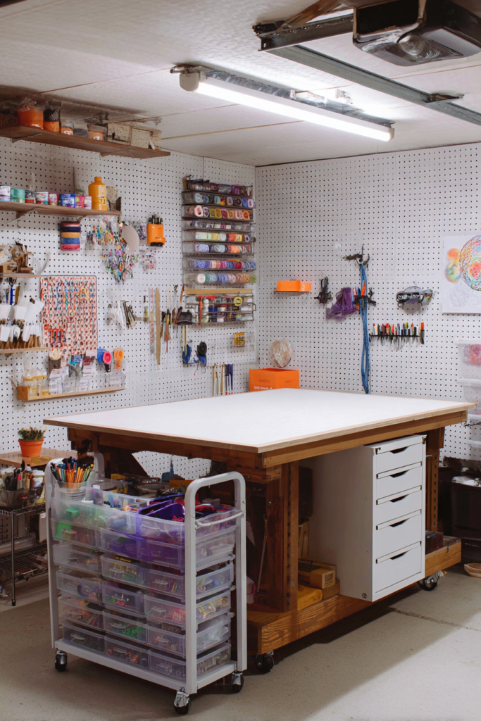 A dedicated crafting station unleashes creativity in your garage hangout. Start with a sturdy table or desk that can handle various projects and potential messes. Install a pegboard above for organizing tools, scissors, and supplies within easy reach. Good task lighting is essential for detailed work. I always include storage bins or drawer units for sorting materials by type or color. A rolling cart offers mobility for supplies you use frequently. Consider adding a cutting mat, rulers, and other essential tools. This station works perfectly for hobbies like model building, scrapbooking, or painting. The garage setting means you won’t worry about making a mess.