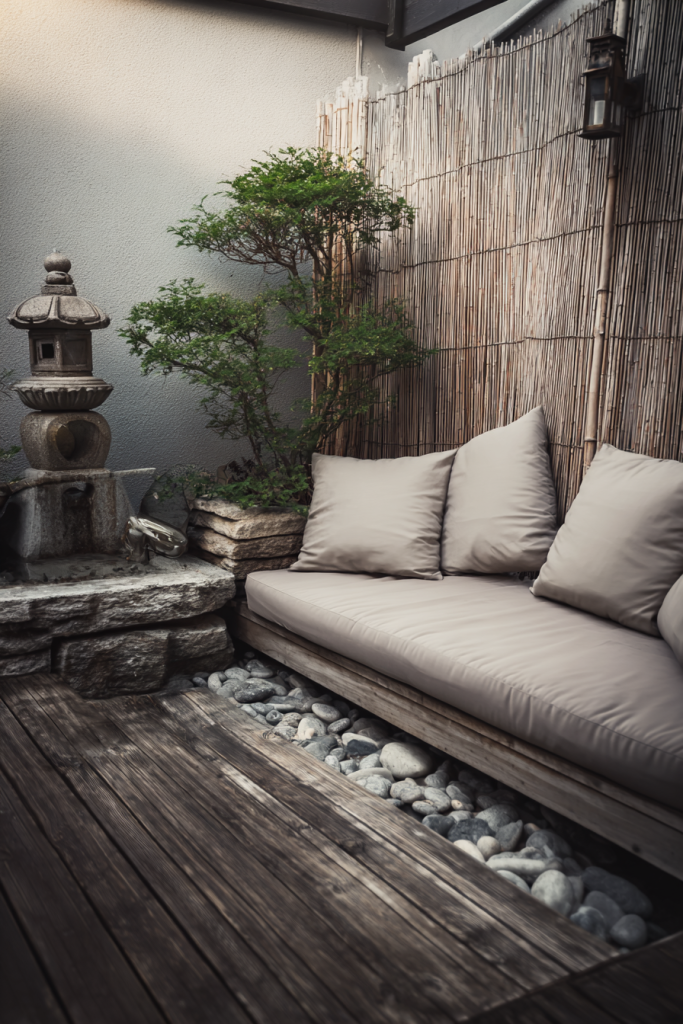 Design a serene meditation space inspired by Japanese garden principles. I’ve created a peaceful zen corner that helps me decompress after stressful days. Use simple wooden benches or a platform for floor seating with cushions. Incorporate bamboo elements through screens or plant choices. Add a small tabletop fountain for soothing water sounds. Arrange smooth river rocks decoratively in trays or around plant bases. Choose minimalist planters in neutral tones for bonsai trees or Japanese maples. Keep the color palette natural with greens, grays, and wood tones. A stone lantern adds authentic garden detail. The focus on simplicity, natural materials, and mindful arrangement creates a contemplative atmosphere perfect for meditation or quiet reflection.