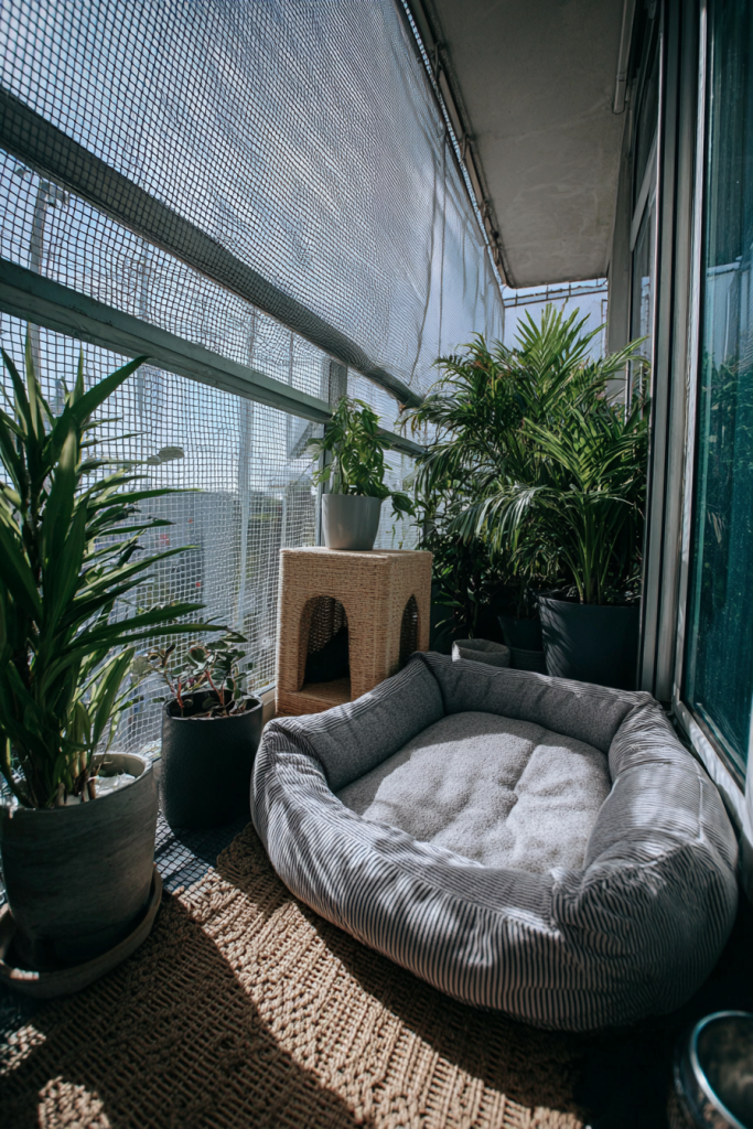 Design your balcony with your furry friends in mind for shared outdoor enjoyment. I’ve made my balcony safe and entertaining for my pets. Install pet-safe screening or barriers to prevent escapes or falls. Choose non-toxic plants like spider plants, Boston ferns, or cat grass. Create a designated pet lounging area with outdoor pet beds or cushions. Add a small water station with a spill-proof bowl. Include interactive elements like a scratching post or toys secured to railings. Use durable, easy-to-clean flooring materials. Provide shaded areas where pets can cool down. This thoughtful approach means your pets can safely enjoy outdoor time while you relax together in your enhanced balcony space.
