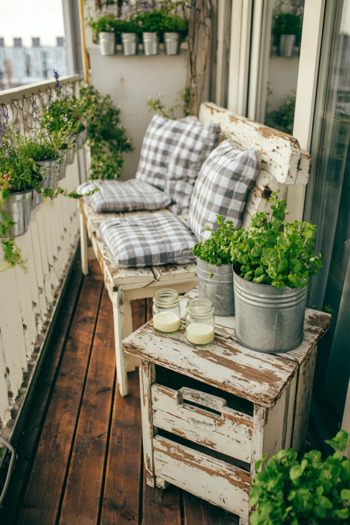 Embrace weathered wood and vintage-inspired elements for cozy farmhouse appeal. I love how this style feels welcoming and lived-in from day one. Choose distressed wooden furniture or age new pieces with paint techniques. Use galvanized metal planters and watering cans as decorative elements. Add mason jars as candle holders or vases for wildflowers. Incorporate plaid or gingham patterns through cushions and tablecloths. A vintage wooden crate serves as a side table or plant stand. White painted wood combined with natural wood tones creates classic farmhouse contrast. Hanging plants in enamelware containers complete the countryside aesthetic. This approachable style makes your balcony feel like a charming cottage retreat.