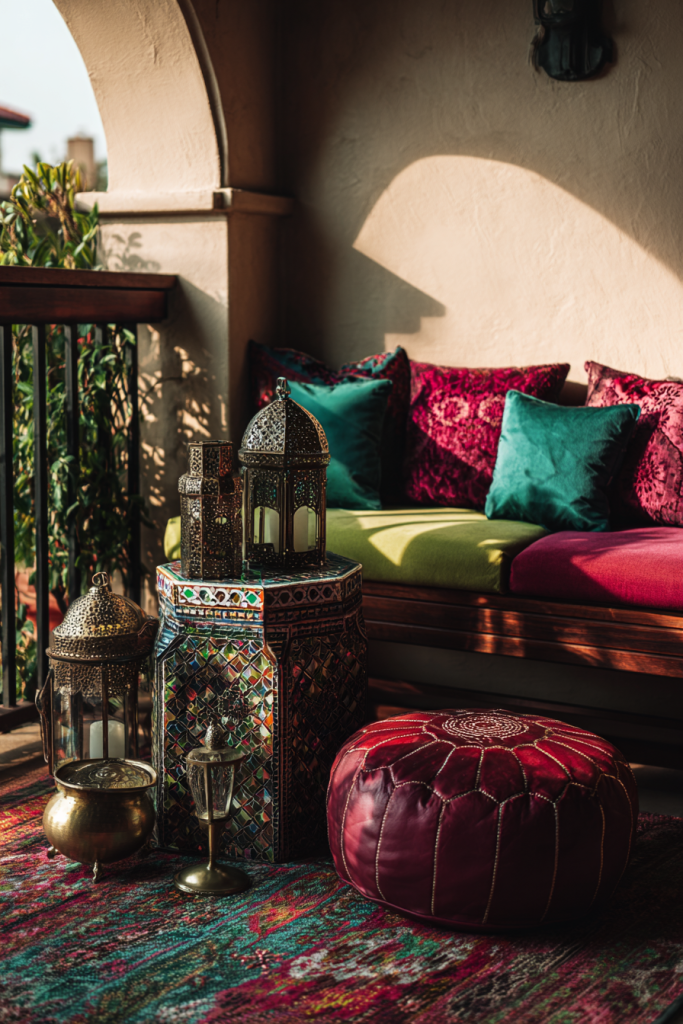 Transport yourself to Marrakech with vibrant Moroccan-inspired decor elements. I’m captivated by the rich colors and intricate patterns that define this style. Incorporate jewel tones like emerald, sapphire, and ruby through cushions and textiles. Add a metal lantern with cut-out patterns that cast beautiful shadows when lit. Use a colorful mosaic side table or tile accents on surfaces. Hang a patterned outdoor rug in warm sunset hues. Include poufs or floor cushions for casual, low seating. Metallic accents in brass or copper add warmth and authenticity. Fragrant plants like jasmine complete the sensory experience. This exotic style turns your small balcony into an enchanting retreat that feels worlds away from everyday life.