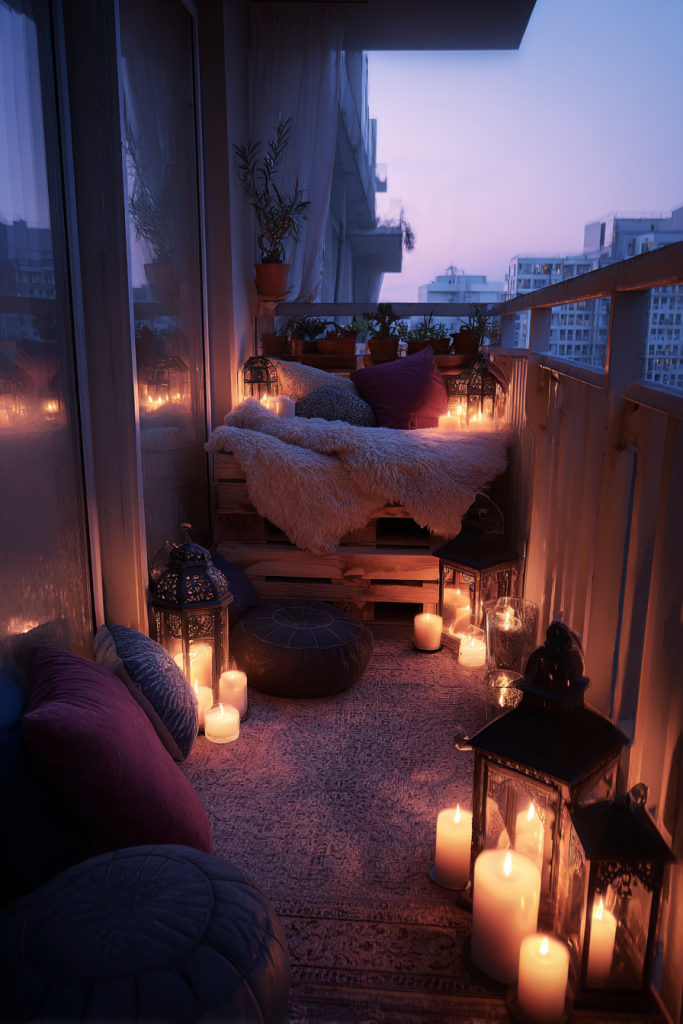 Create romantic, intimate atmosphere through strategic candle placement and cozy lighting layers. I collect various sizes of lanterns, hurricane candles, and pillar candles to create a warm glow on calm evenings. Group candles at different heights on side tables, the floor, or hanging lanterns from hooks. Choose unscented candles to avoid competing with natural outdoor scents. Battery-operated LED candles offer a safe, wind-resistant alternative that still provides ambient lighting. Combine candlelight with soft textiles like faux fur throws and velvet cushions for maximum coziness. The flickering light creates shadows and depth that make your balcony feel larger and more enchanting. This setup is perfect for date nights or solo relaxation sessions.