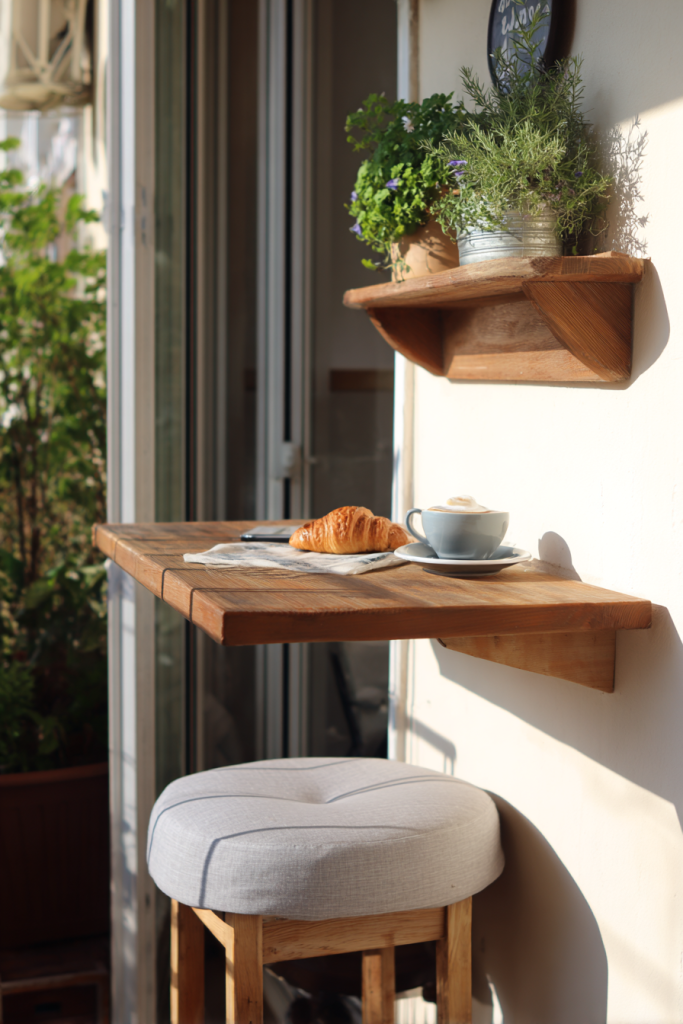 Transform your balcony into an outdoor breakfast nook that makes mornings special. I start every day in my balcony breakfast spot when weather permits. Install a narrow console table or wall-mounted shelf that’s just deep enough for a coffee cup and plate. Add a comfortable stool or chair with a cushioned seat. Position it to catch morning sunlight and pleasant views. Keep a small basket with outdoor dining essentials like napkins and a thermos. Hang a small shelf above for a French press or decorative items. Add a potted herb garden nearby so you can snip fresh basil or mint for your meal. This dedicated breakfast area encourages you to slow down and savor quiet morning moments outdoors.