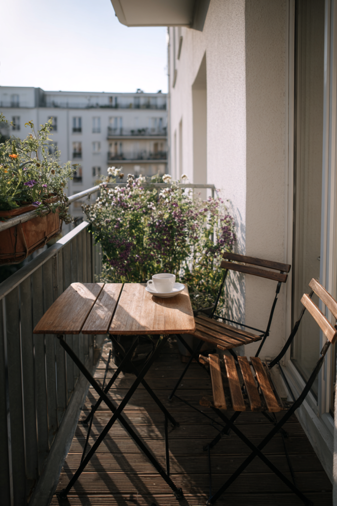 A classic bistro set brings European café charm to even the tiniest balcony. I love how a small round table with two folding chairs creates an intimate dining spot without overwhelming the space. Choose metal frames in black or white for a timeless look, or opt for colorful powder-coated finishes for a playful vibe. The foldable feature means you can tuck them away when not in use. Add a small vase with fresh flowers or a potted plant as a centerpiece. This setup is perfect for morning coffee, al fresco meals, or evening wine with a friend. The compact footprint leaves room for plants along the railings while still providing a dedicated dining area.