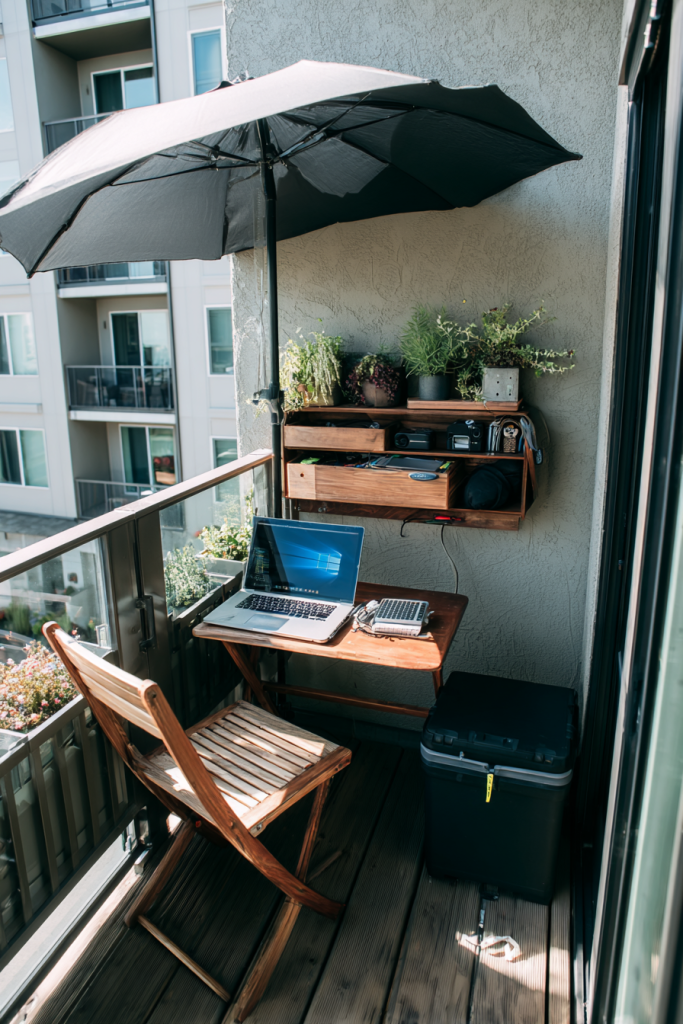 Maximize your balcony’s functionality by creating a refreshing outdoor workspace. I work from my balcony whenever possible for the productivity boost fresh air provides. Install a wall-mounted fold-down desk or use a narrow console table. Add a comfortable chair with proper back support. Ensure you have shade during peak sun hours through an umbrella or awning. Use a waterproof laptop sleeve for protection. Keep supplies in a weather-resistant storage box. Position the workspace to minimize screen glare. Add plants around the perimeter to create a calming work environment. String lights overhead make evening work sessions pleasant. This setup offers a welcome change from indoor home office monotony while maintaining productivity.