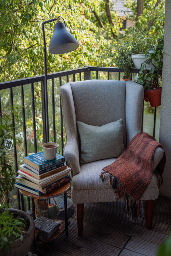 Design a dedicated reading corner that becomes your favorite escape from daily life. I’ve created a cozy reading nook on my balcony that rivals any indoor spot. Position a comfortable armchair or chaise lounge in the corner with the best natural light. Add a small side table at arm’s reach for your coffee and current book. Install a wall-mounted reading light for evening sessions. Layer the chair with a soft throw blanket and supportive lumbar pillow. Keep a small basket nearby for storing books and magazines. Add a potted plant beside the chair for a touch of nature. The outdoor setting adds fresh air and natural sounds to your reading experience, making it even more immersive and relaxing.