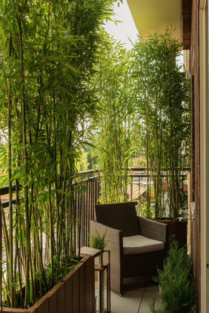 Create a natural privacy barrier using tall planters with bamboo, ornamental grasses, or climbing vines. I appreciate how this approach blocks unwanted views while maintaining an organic, garden-like feel. Position tall, narrow planters along the railing or in corners where you need the most screening. Bamboo grows quickly and provides excellent coverage year-round. Alternatively, train climbing plants like jasmine or clematis up a trellis for seasonal privacy with beautiful blooms. The vertical growing pattern doesn’t consume floor space while delivering maximum privacy benefits. This living screen also reduces noise and creates a microclimate that feels more secluded. Your balcony becomes a hidden sanctuary where you can truly relax without feeling exposed.