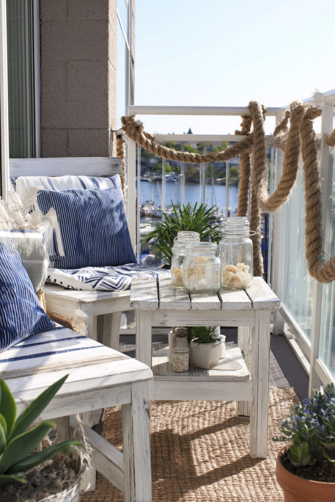 Bring seaside serenity to your balcony with a coastal-inspired design palette. I’m drawn to the calming effect of blues, whites, and sandy neutrals reminiscent of beach days. Choose weathered wood furniture or paint existing pieces in distressed white for that driftwood look. Add navy and white striped cushions or pillows for classic nautical style. Incorporate natural rope elements through macramé plant hangers or rope-wrapped railings. Display seashells in glass jars or hurricane vases as decorative accents. A sisal or jute rug adds texture underfoot. Potted succulents and sea grass complete the beachy aesthetic. This theme works beautifully whether you live near the ocean or miles inland, creating a perpetual vacation atmosphere right outside your door.