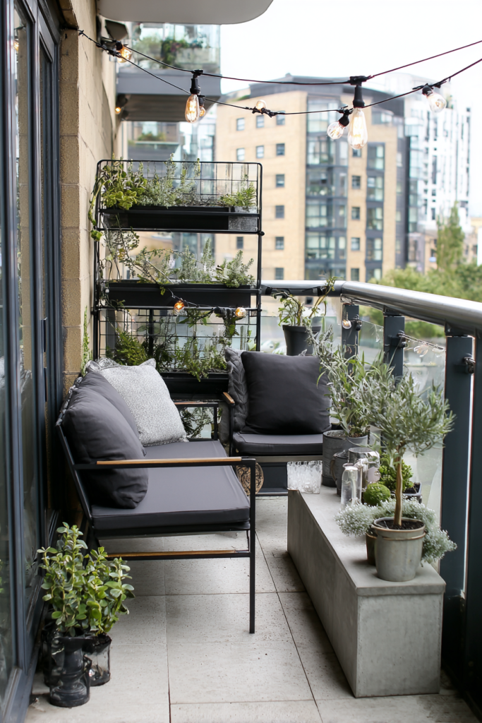 Embrace raw materials and urban aesthetics with an industrial-inspired balcony design. I love how exposed metal, concrete elements, and dark color palettes create an edgy, contemporary vibe. Choose furniture with metal frames in black or gunmetal finishes. Incorporate concrete planters or a concrete-look floor. Balance the hard materials with soft textiles like plush cushions and throw blankets in charcoal or olive green. Add Edison bulb string lights for vintage industrial lighting. Metal shelving units provide vertical storage for plants and decorative items. The contrast between rough industrial elements and comfortable textiles creates visual interest. This style suits urban environments perfectly and feels authentically connected to the cityscape surrounding your balcony.